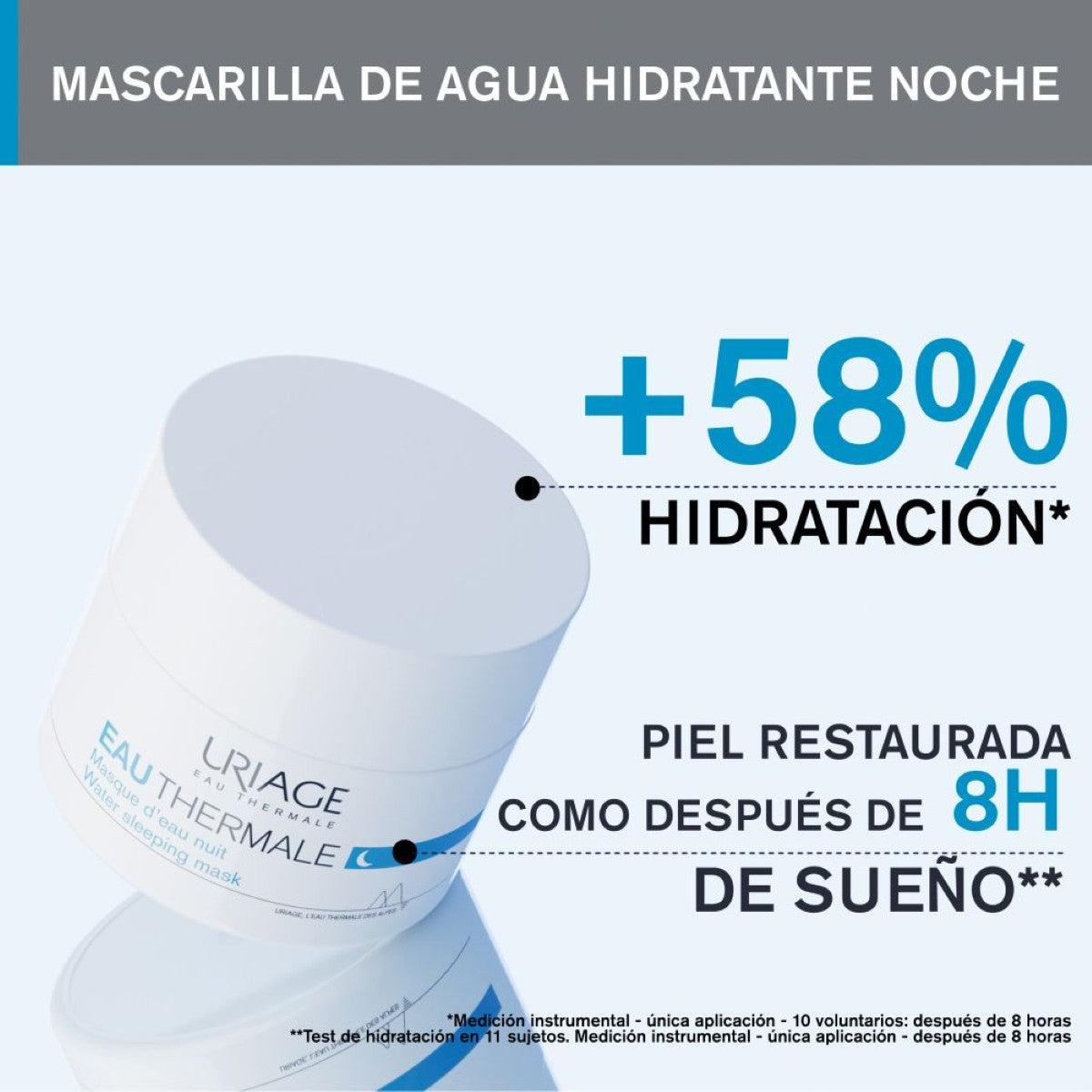 Máscara de Agua de Noche ultra ligera con todo el poder del Agua Termal Uriage y un complejo hidro-termal único que revitaliza la piel. Actúa durante la noche sin manchar y entrega efecto de 8 horas de sueño, para una piel iluminada e hidratada.